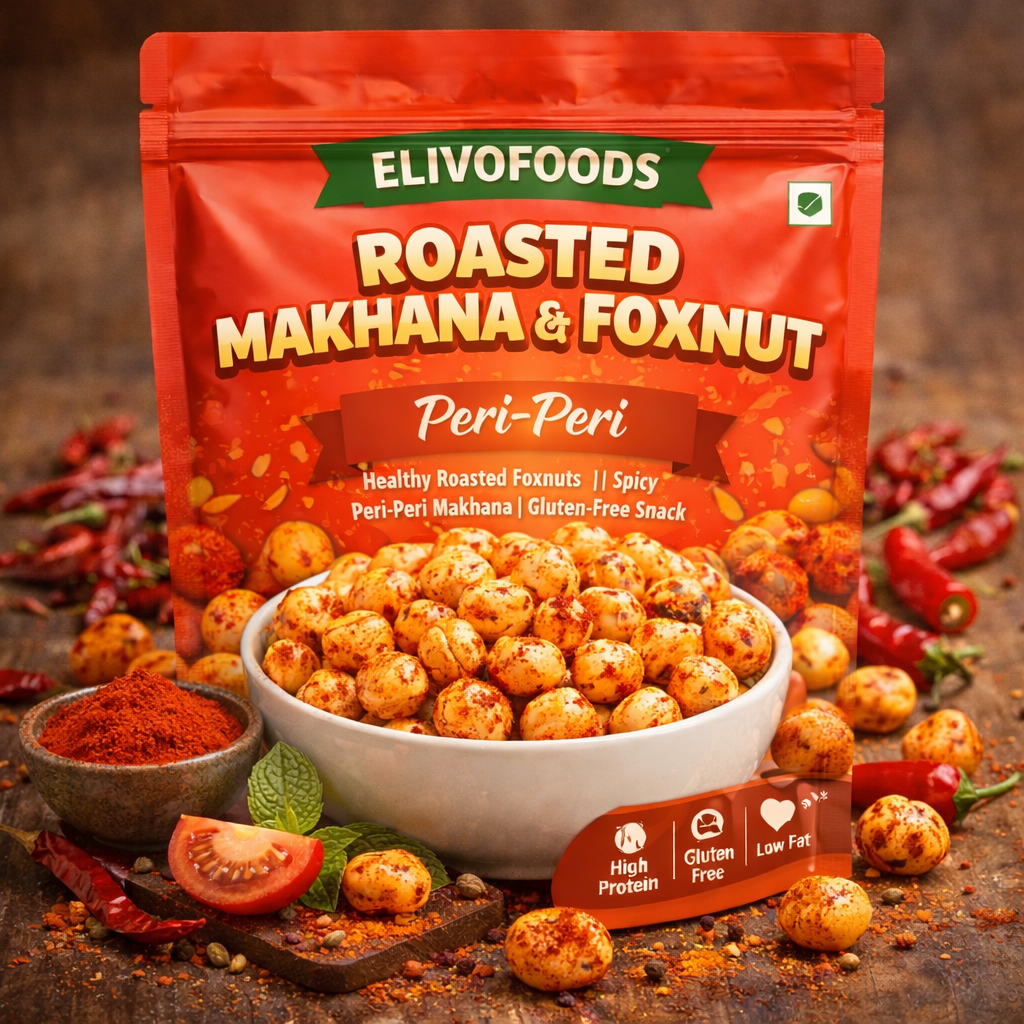 Add a bold twist to your healthy snacking with ELIVO Roasted Makhana & Foxnut – Peri-Peri. Made from premium quality foxnuts (makhana), this crunchy snack is carefully roasted and seasoned with a fiery peri-peri spice blend to deliver an exciting burst of flavour in every bite.